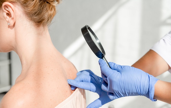 Kiểm tra toàn thân, Dermascope HD, Wood's Lamp, đánh giá ABCDE cho nốt ruồi nghi ngờ.