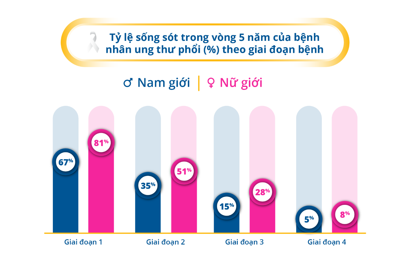 Bảng so sánh tỷ lệ sống thêm 5 năm theo giai đoạn cho các loại ung thư phổ biến: