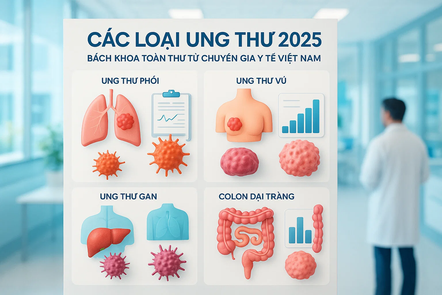 Theo Viện Ung bướu Quốc gia và Bộ Y tế, top 10 loại ung thư phổ biến nhất tại Việt Nam năm 2025 bao gồm: ung thư gan (22,000 ca), ung thư phổi (21,500 ca), ung thư dạ dày (17,800 ca), ung thư đại trực tràng (17,200 ca), ung thư vú (16,900 ca ở nữ), ung thư cổ tử cung (8,500 ca), ung thư tuyến tiền liệt (7,800 ca ở nam), ung thư tụy (6,200 ca), ung thư thực quản (5,900 ca) và ung thư buồng trứng (4,300 ca).
