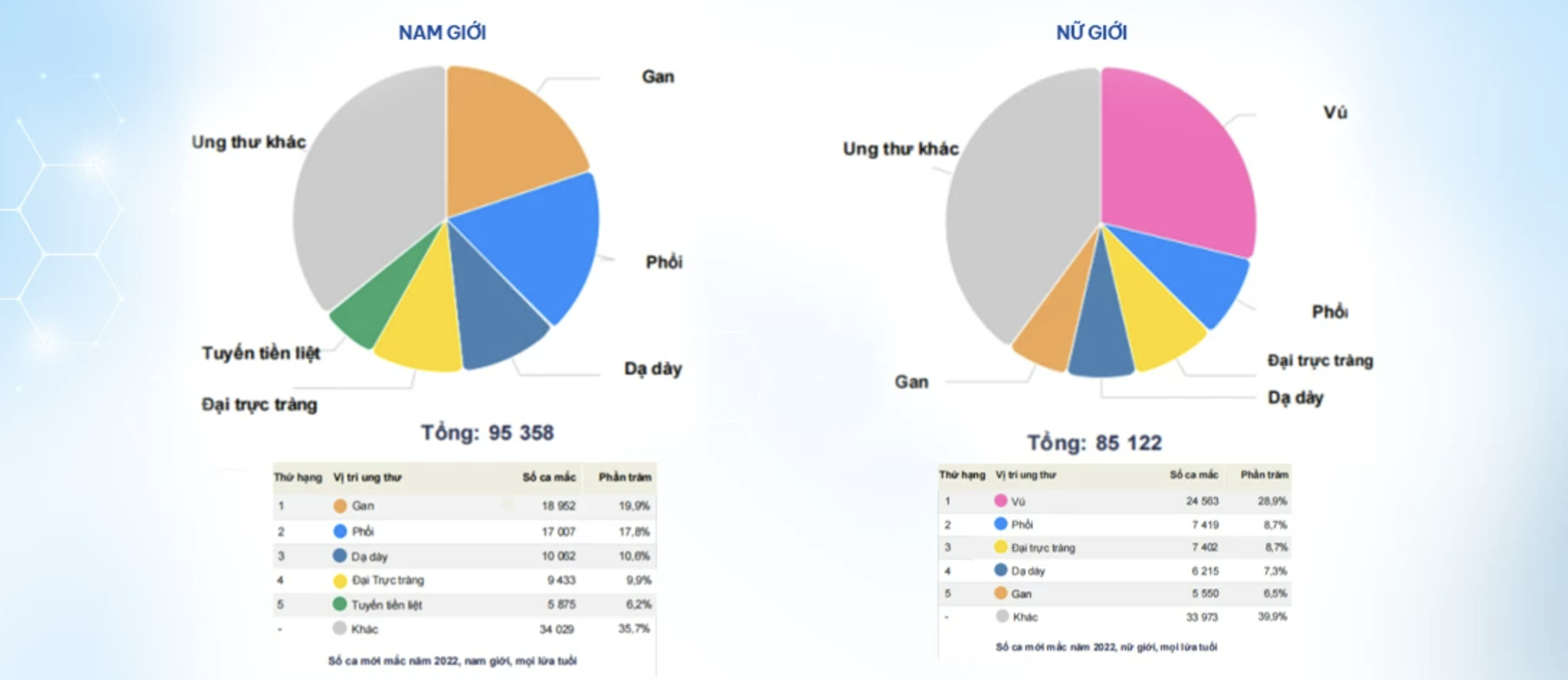 Báo cáo của Tổ chức Y tế Thế giới (WHO) năm 2024 ghi nhận Việt Nam có khoảng 165.000 ca ung thư mới và 114.000 ca tử vong do ung thư mỗi năm. Các loại ung thư phổ biến nhất gồm ung thư phổi (23.481 ca), ung thư vú (21.555 ca), ung thư gan (25.335 ca) và ung thư dạ dày (17.527 ca).